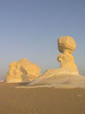 we: Date: 15th September 2005 End GPS: N27 16.990 E028 11.371 Total Kilometres: 71,937km Weather: 35.8C Camping: bushcamp white desert Ah, finally something to rave about on the western desert BORING route. The White desert, now this is worth venturing too. But I would suggest coming from Cairo for a few days and then returning back to Cairo as the route south holds no other interest. The white desert is awesome, spectacular, inspiring, eerie, weird, and visually stunning. It's like driving into a giant 3 dimensional Picasso work of art. Giant white mushrooms, skulls, devils, dragons and towering chess pieces litter the land, rising out of the white sand like monuments to a forgotten god. The sun conspires with them to play games with your eyes and imagination. As it sinks lower in the afternoon, its golden rays cast long grotesque and distorted images over the sand, and as the shadows wander across the statues they morth, like a camelion changing its colours. I watched as one statue changed from a dragon, into a pharaoh and then into a giant white chess horse that threatened to charge me if I did not move out of its way.