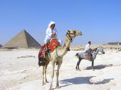 We have made our home at the Salma camp a bit of a desolate place with no character of charm and certainly a place that has seen better days. But it is fairly central for getting into the heart of Cairo and for visiting the Pyramids. Indeed we even have a wonderful view of the wonders from our rooftent. We are staying in Cairo for a few days to obtain our Syrian visa, which entails us having to obtain a 6 months tourist visa for Egypt? Why we have to have a 6 months Egyptian tourist visa to get our Syrian visa is beyond me, anyone have any ideas? We are also using the time to explore Cairo's fantastic bazaar of Khan el Khalili, the Egyptian museum which houses thousands of artifacts from the Valley of the Kings and the legendary Tut Ankh Amon, as well as the mummies themselves. And of course no visit to Cairo is complete without a visit to see the Pyramids and the Sphinx. These 5000 year old monsters of architectural genius and symbolism, a 7th wonder of the modern world, and testaments to the power and godly stature of the pharaohs, Khufu, Khafre and Menkaure, are only eclipsed in their majesty by the Abu al-Hol or Father of Terror, better known as The Sphinx. These shrines, built to protect and guide the pharaohs on their journey into the after life have served their purpose well and have immortalised their owners forever. The pyramids of Khufu (Cheops) was built in 2600BC and towers a staggering 146.5 metres into the heavens. The pyramids have weathered the centuries well and have even survived the attempted destruction of them by a 16th century caliph. Indeed the pyramid of Menkaure (Mycerinus) still to this day has the original limestone casing at its peak. The pyramids are awesome today, but when they were first built they must have been staggering in their perfection, symmetry and polish. Tagebuch